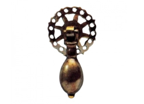 A traditional style brass drop handle (antique finish). A fancy forged solid brass teardrop handle attached to a brass hook spindle. Passes through a stamped fretted round backplate and secures inside the drawer front with a small steel nut. Made from original dies and patterns in the UK.