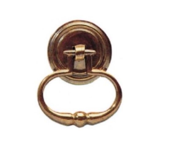 A traditional style brass drop handle (antique finish). A fancy forged brass drop attached to a brass hook spindle. Passes through a stamped round backplate and secures inside the drawer front with a small steel nut. Made from original dies and patterns in the UK.